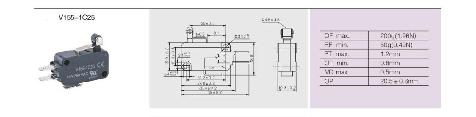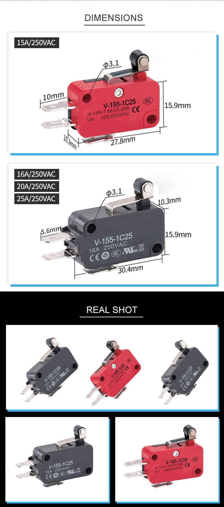 SYV-155-1C25 15A/250VAC Short roller lever type Micro Switch